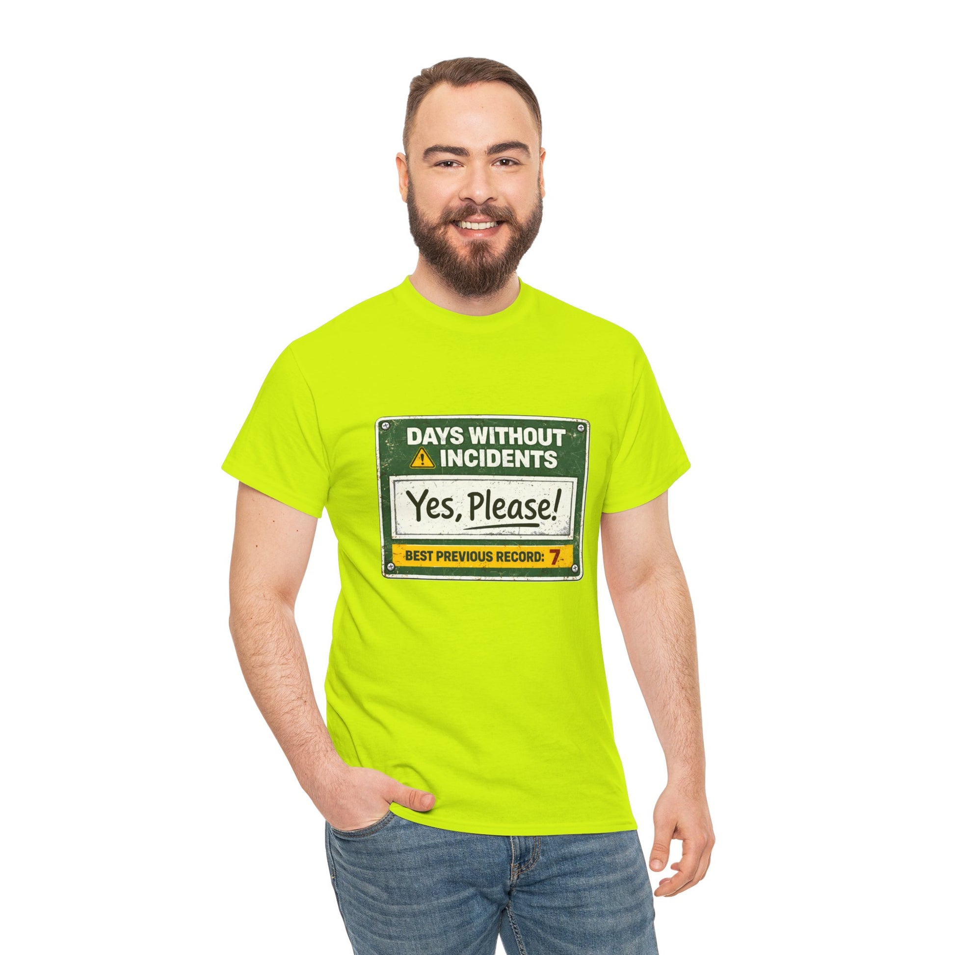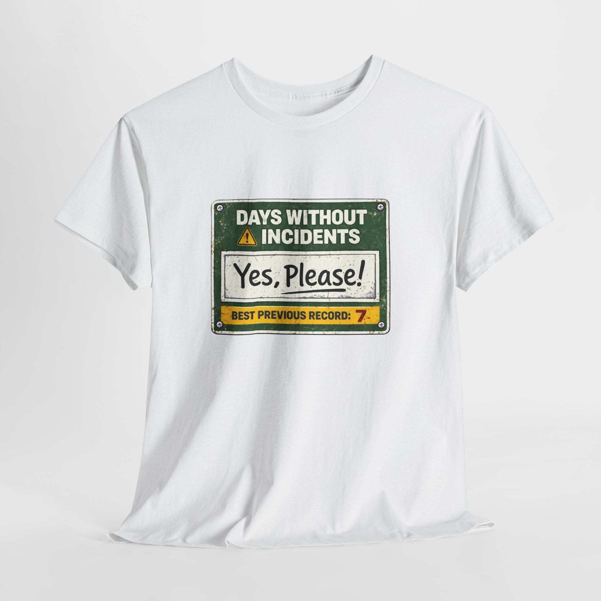 This design flips the classic safety board on its head with “Days Without Incidents — Yes, Please!”, plus the painfully realistic “Best Previous Record: 7.” It’s the kind of humor that only comes from real job sites, real crews, and real near-misses.