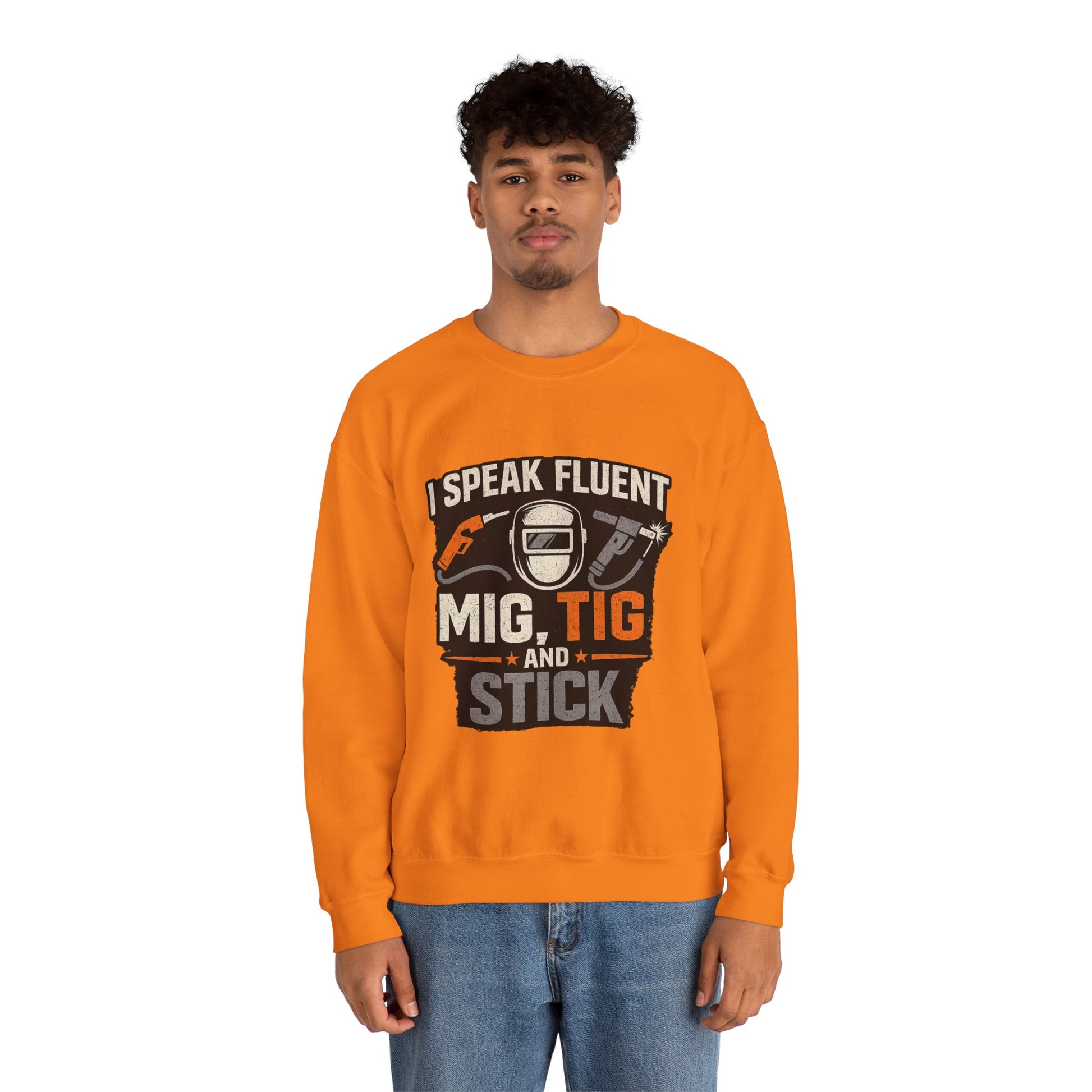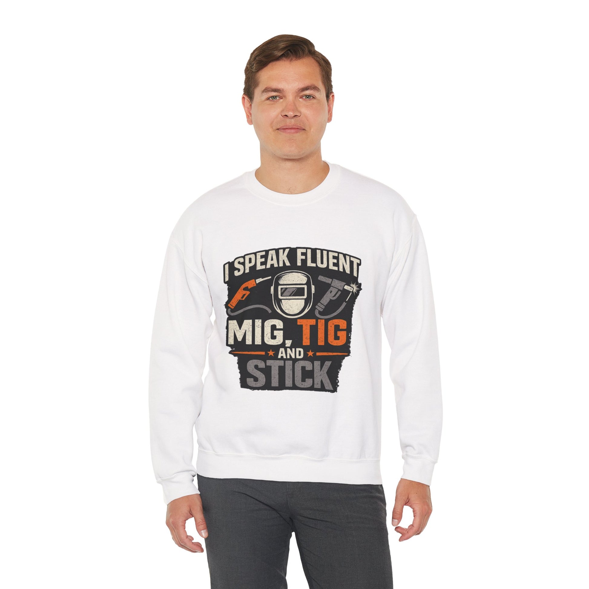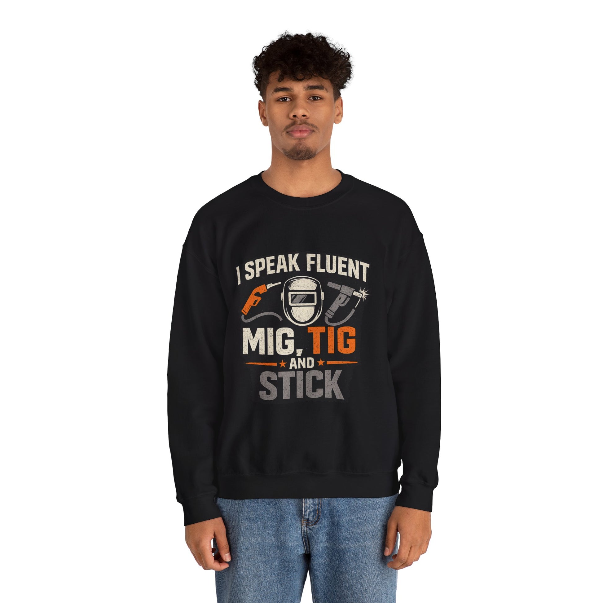 This bold design features the phrase “I Speak Fluent MIG, TIG, and STICK”, paired with classic welding imagery that every tradesperson instantly recognizes. It’s a nod to skill earned through time under the hood, burned gloves, steady hands, and pride in clean beads.