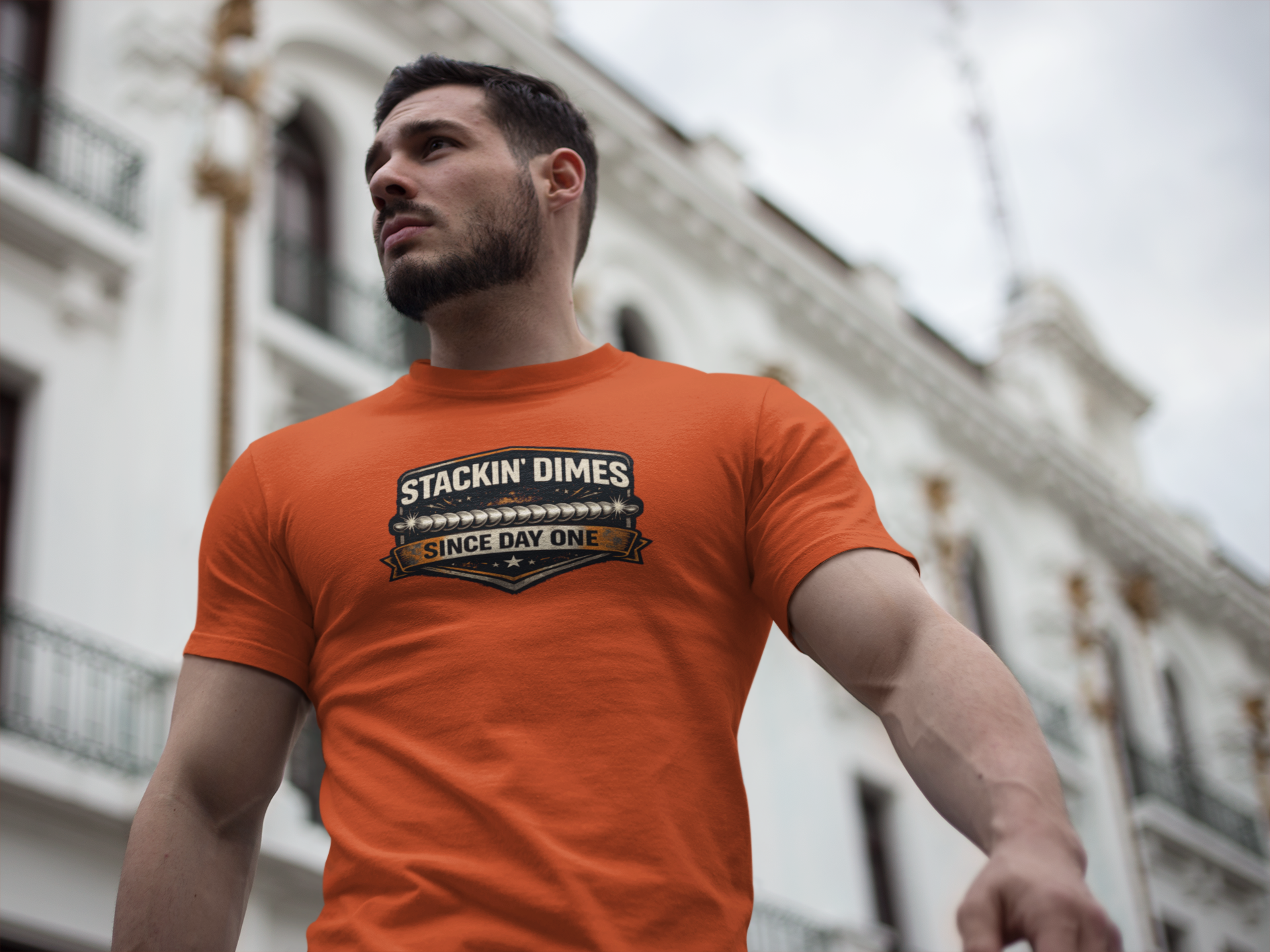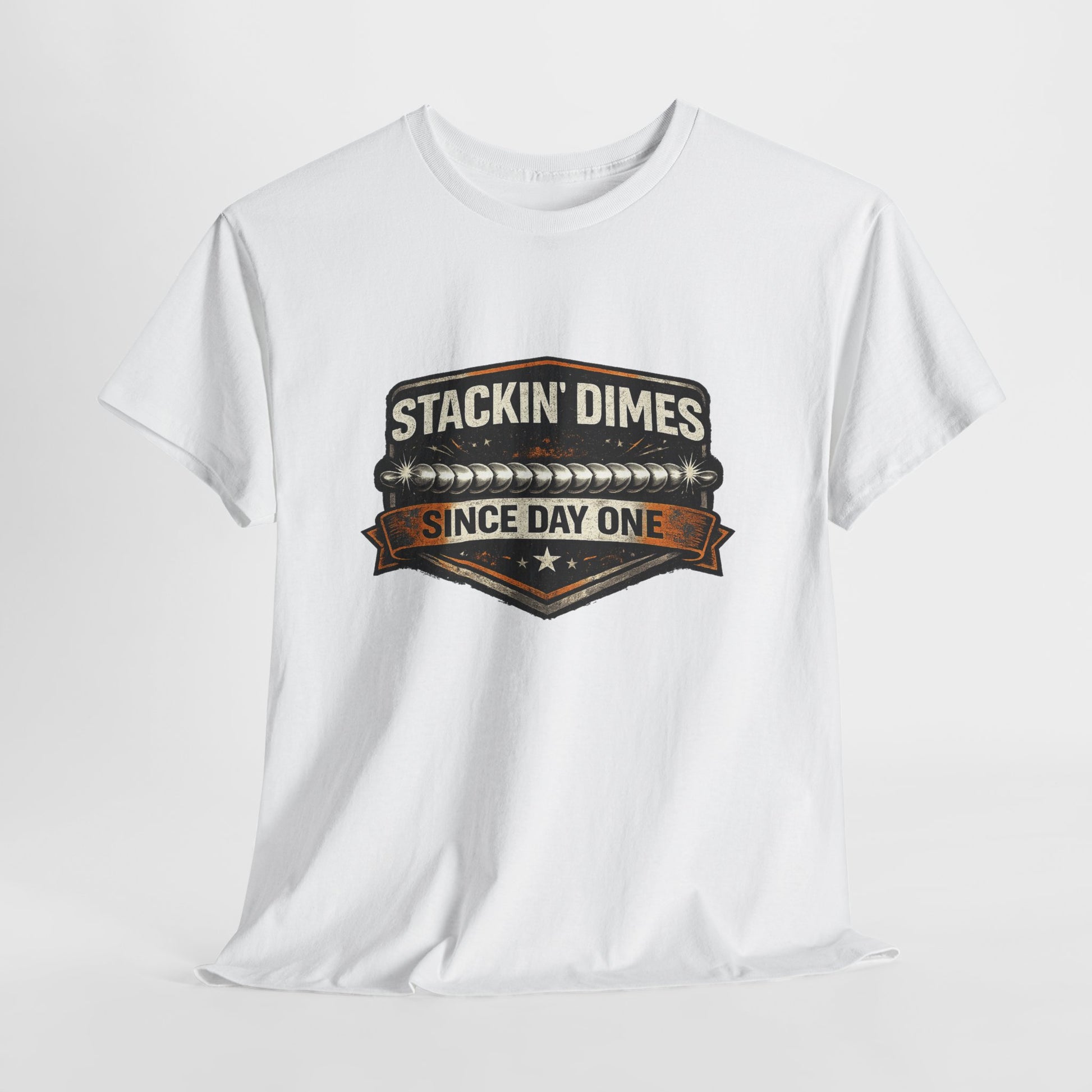 This design features the phrase “Stackin’ Dimes Since Day One”, a respected expression in the welding world that represents clean, consistent welds and craftsmanship earned through experience. The stacked-dime visual reinforces pride in technique, patience, and doing it right from the start.